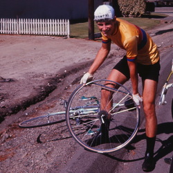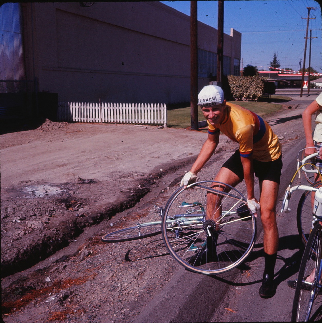 As we often did, we are taking a break at a local store along the way for soft drinks and snacks. At the bottom left is Jeff Cowdrey, wearing the then-popular in the club red beret, checking out a bike. In the back, near the center, drinking from a water bottle, is Fred Brockman. Some of the other people look familiar, but we have yet to associate them with a name.