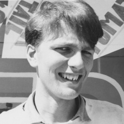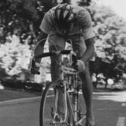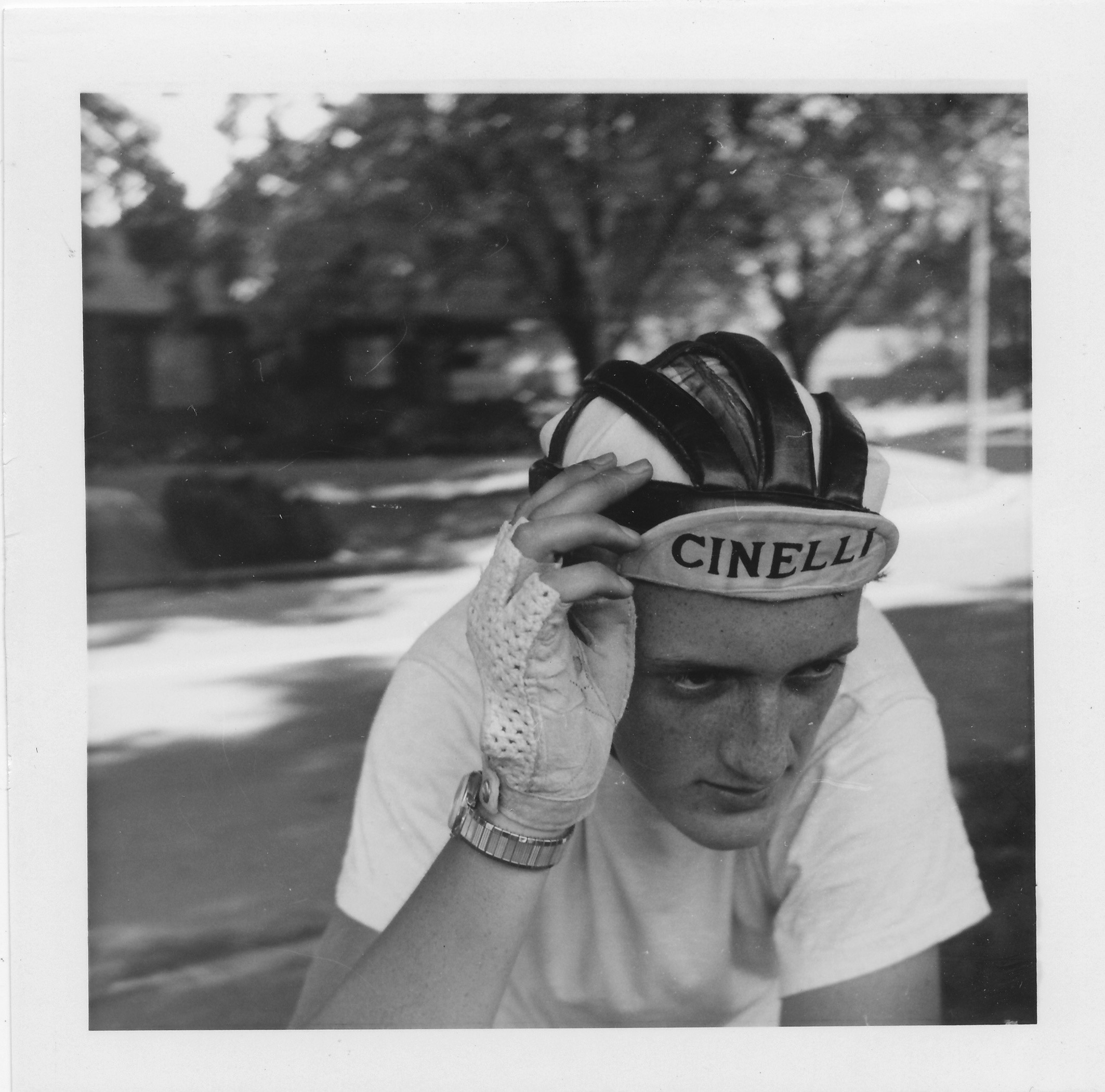 Tom Woods, looking goofy. Note the leather strip helmet that we all wore "back in the day" (but only when racing.) I still prefer this style of glove to what is available today. Tom is posing on my Peugeot PX10.