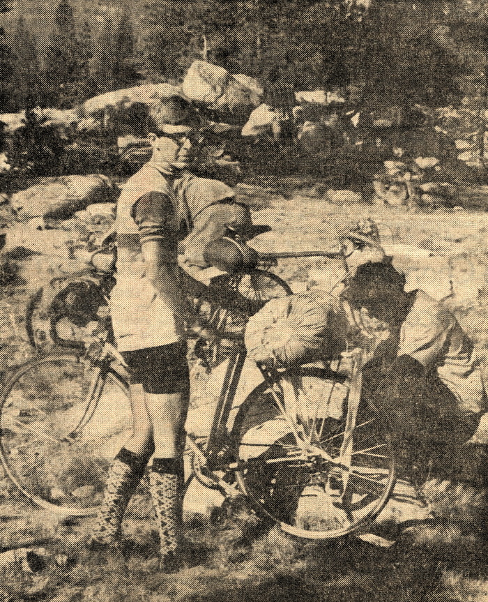 All of the youths completed the trip except Zeff, who returned after two days. Brockman's derallleur gear on his bicycle broke just after the group entered Yosemite National Park, but, with Zeff returning, a swap was made and Fred continued the journey with Jared's bike. This was Zeff's first ride with the youths, who last year made a similar trip of 389 miles. The remaining seven cyclists experienced little difficulty the rest of the journey although the headlight on Woods' bike fell into the wheel as he started down Tioga Pass and he had to replace several spokes from his reserve supply. Campopiano's bike suffered a broken chain soon after the young men had passed the summit of Monitor Pass. 'It was easy to repair, though, and we soon were on our way again," the cyclist declared. Haack, Zeff and Wilcox belong to the Macht Schnell cycle Club, an outgrowth of a now defunct Young Men's Christian Association club in Modesto. Its name means "hurry up" in German. Woods, Cowdrey, Rosenow, Campopiano and Brockman are members of the Modesto Roadmen, a bicycle club which promoted yesterday's second annual Tour De Graceada bicycle races. Cowdrey was sixth in the junior competition and Woods placed 10th.