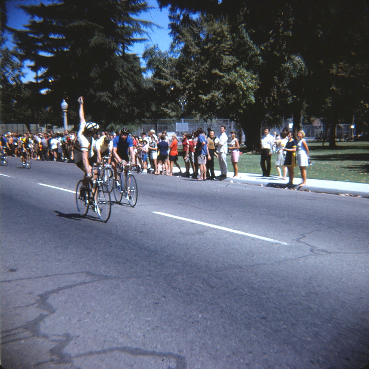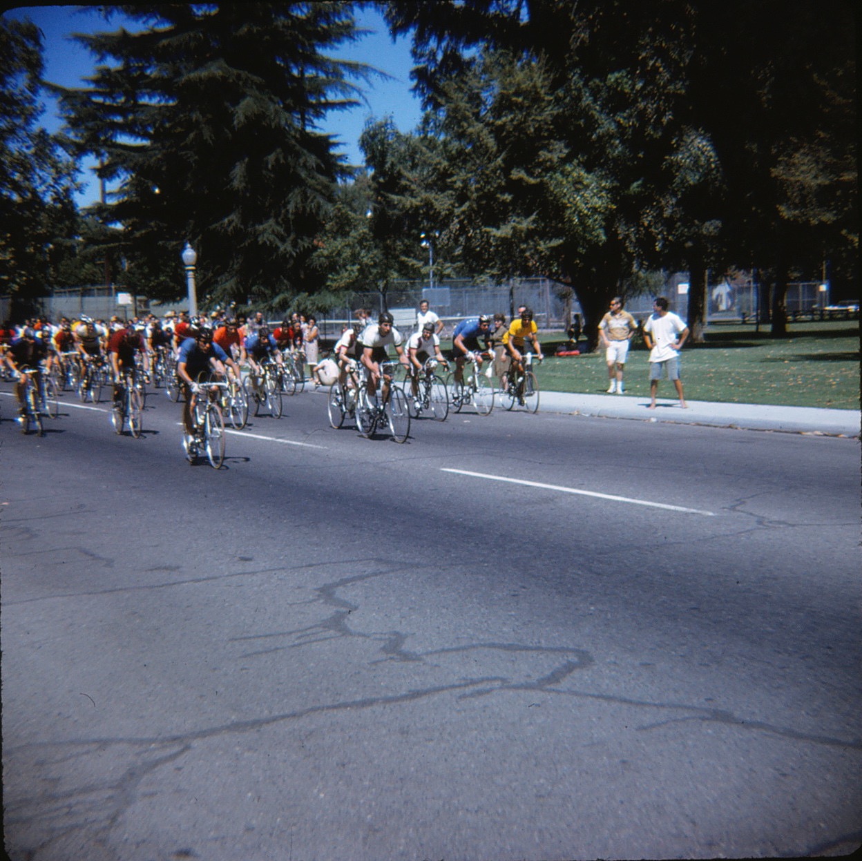 The Modesto Roadmen racing as juniors did much better, where Jeff got sixth place and Tom got tenth from a field of 30 riders. The winners were Ed Kinney, Joe Radialli, and Mark Gates in first through third places respectively. By comparison, of the senior Roadmen racing in a field of 49 riders, none of them placed. Winners of this race were Bob Parsons, Jackie Simes III, and Bob Tetzlaff.