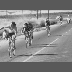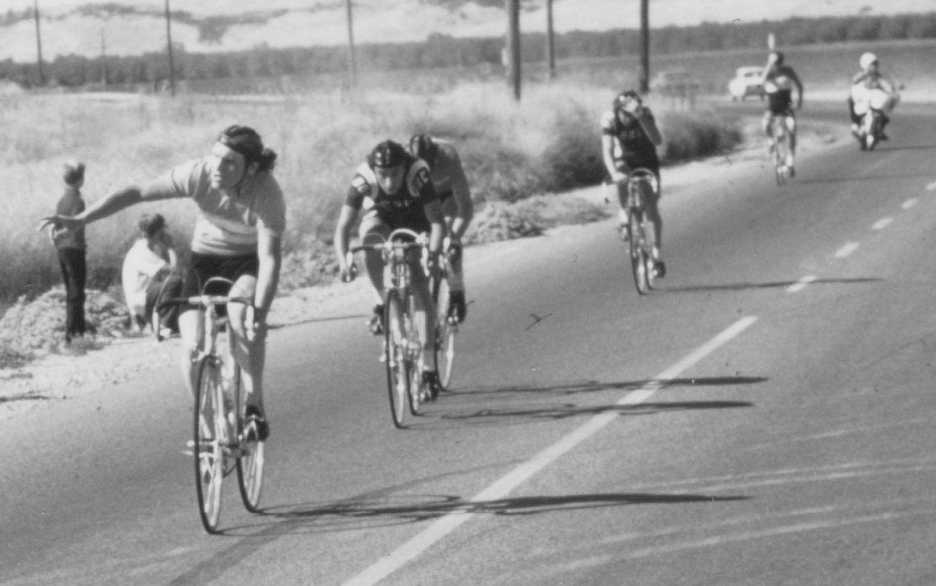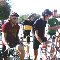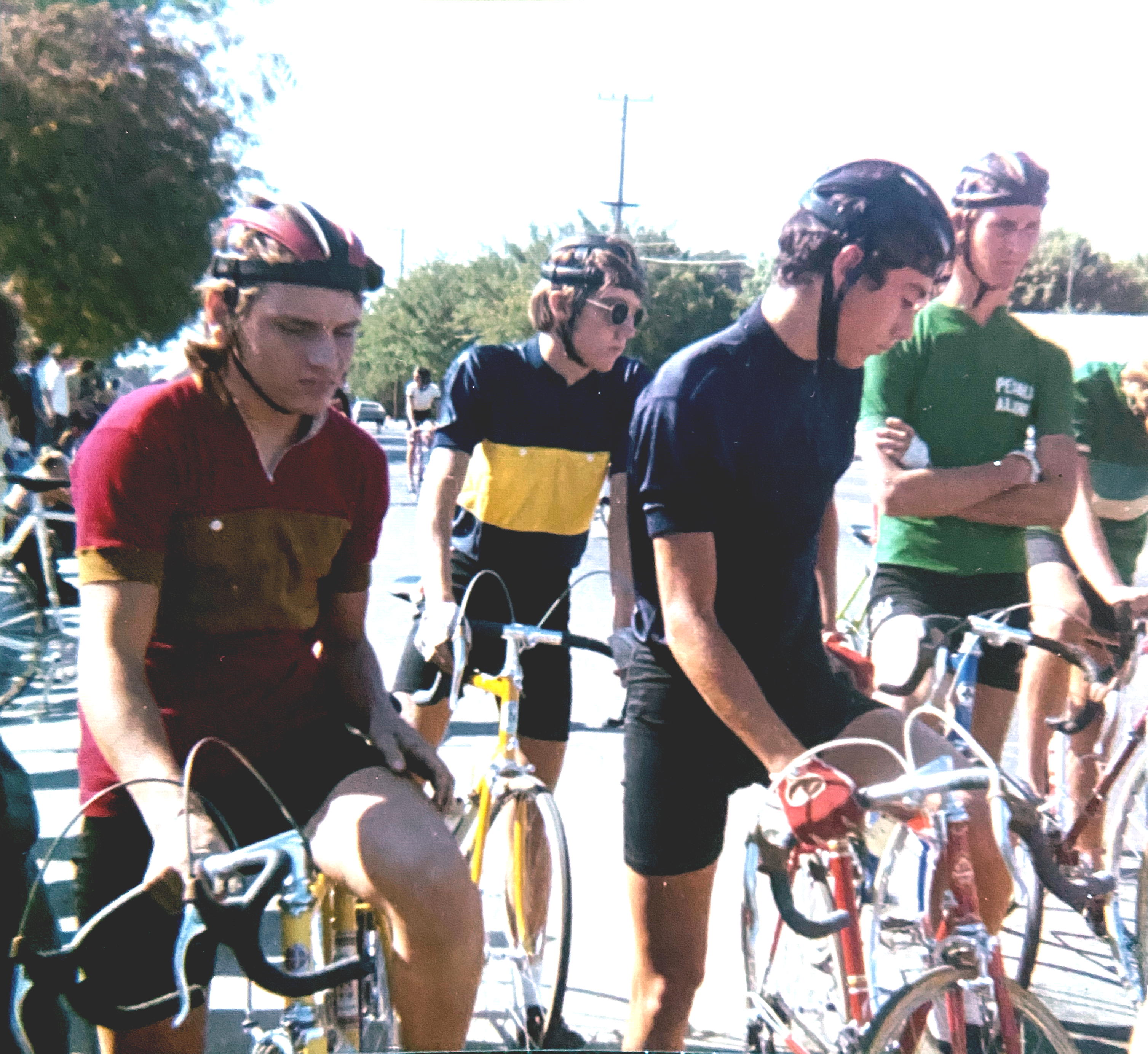 Junior riders at the start of the Modesto Criterium, held at Downey High School. Fron left in the red jersey is Rod Jewett, just behind him in the blue and yellow jersey is Tom James, both of the Modesto Roadmen. (Picture supplied by Tom James.)