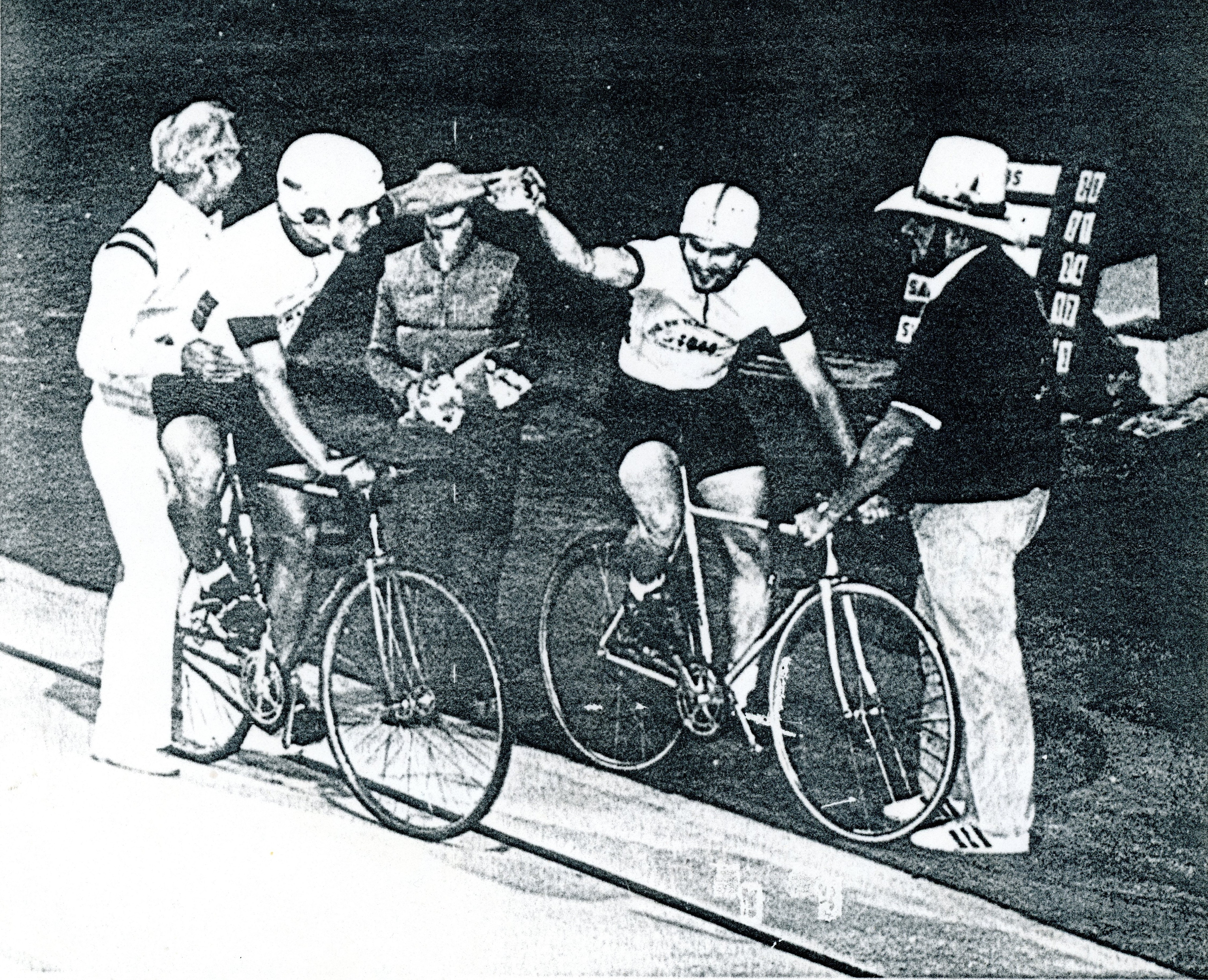 Eight years after pausing his cycling career to finish his education, Rod Jewett began his comeback, this time as a track racer. He raced against the likes of Fred Markum and Eric Heiden. He raced for the Los Altos/Bicycle Outfitter team. Rod Jewett is on the bicycle to right and his teammate Lee Fleming on the left. (Picture supplied by Michael Jewett.)